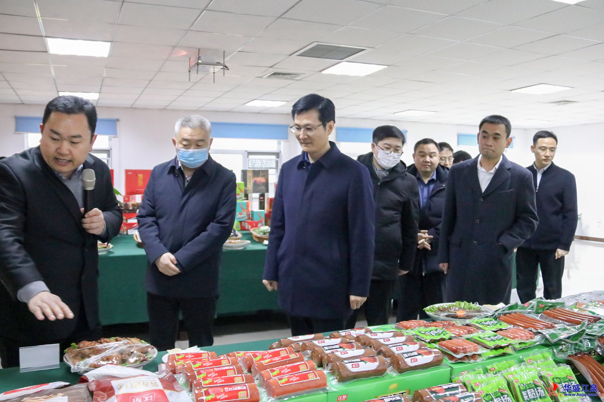 隨后,王映海一行深入臨沂江泉肉制品有限公司生產廠區、食品板塊展示區,實地察看肉制品生產車間運營情況,聽取公司負責人關于企業有效服務“三農”、助推鄉村振興戰略實施的工作匯報。
