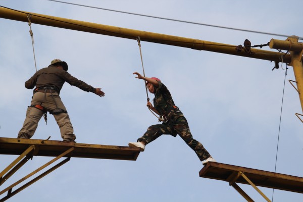在拓展訓練的過程中,大學生們精神飽滿、積極參與,充分展現了江泉人的風采。伴隨著緊張的集合哨聲,訓練課程正式開始,大學生們穿著整齊統一的訓練服,步伐整齊,喊著響亮的口號,將青春的色彩點綴了整個訓練基地。天氣炎熱,但大學生的激情不減,烈日下進行著緊張的訓練,課程緊湊、要求嚴格,每天的訓練都在整齊洪亮的餐訓聲中結束,“軍井未掘,將不言渴;軍灶未開,將不言餓;雨不披蓑,雪不穿裘;將士冷暖,永記我心!”